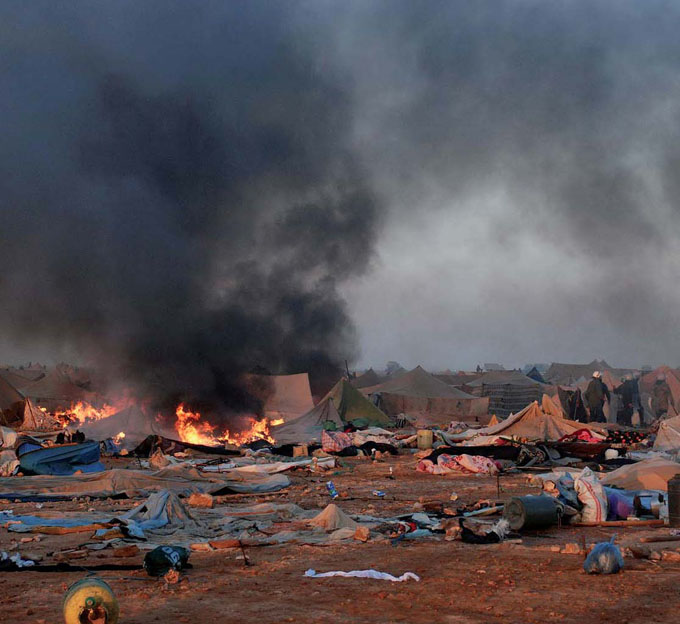 The Gdeim Izik protests started in October 2010 when approximately 5000 Saharawi citizens set up temporary “Camps of Justice” to protest the Moroccan occupation and abuses, and peacefully assert independence. The number soon rose to 15,000 and the United Nations estimated that, at its peak, the camp may have held up to 6,600 tents. The Kingdom of Morocco responded with a violent crackdown on the protesters. Soldiers surrounded the camps in an effort to prohibit food, water and medicine. One month later, the camp was dismantled by Moroccan police and 3000 arrests were made.